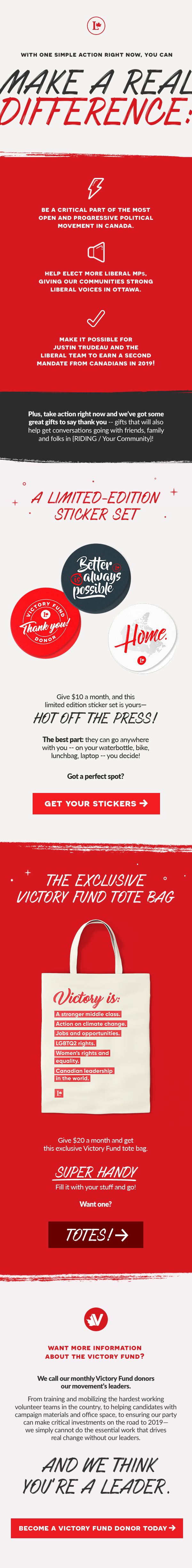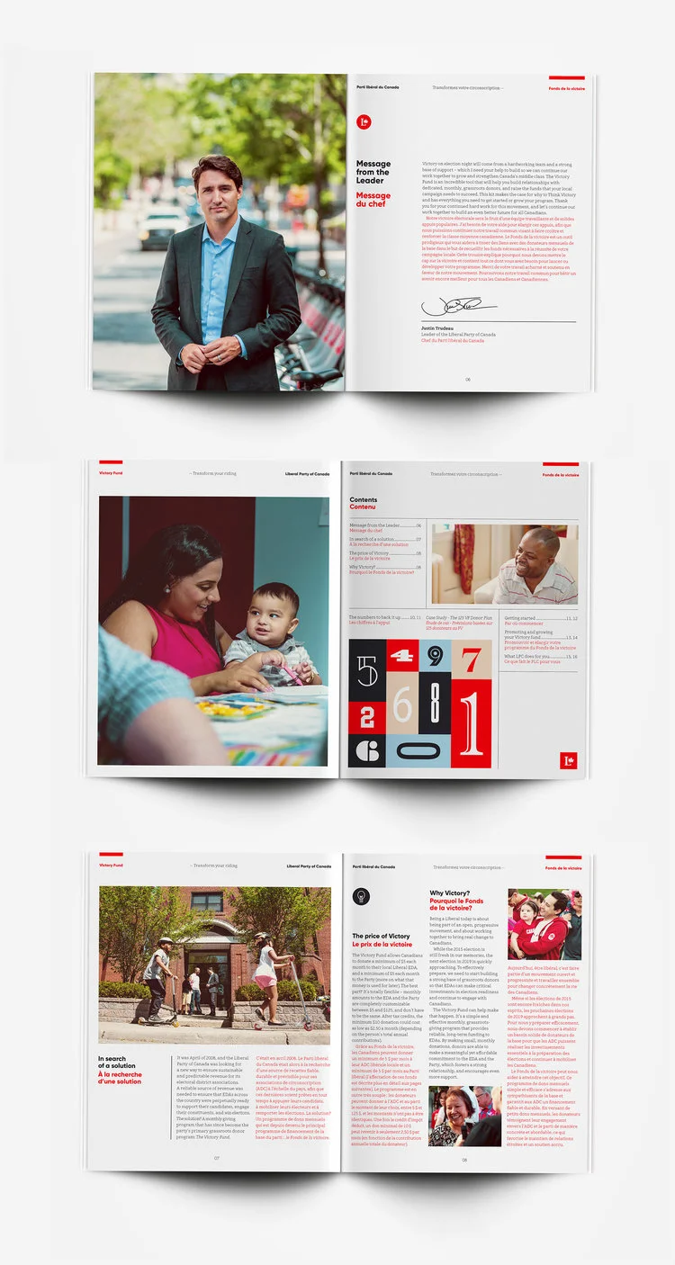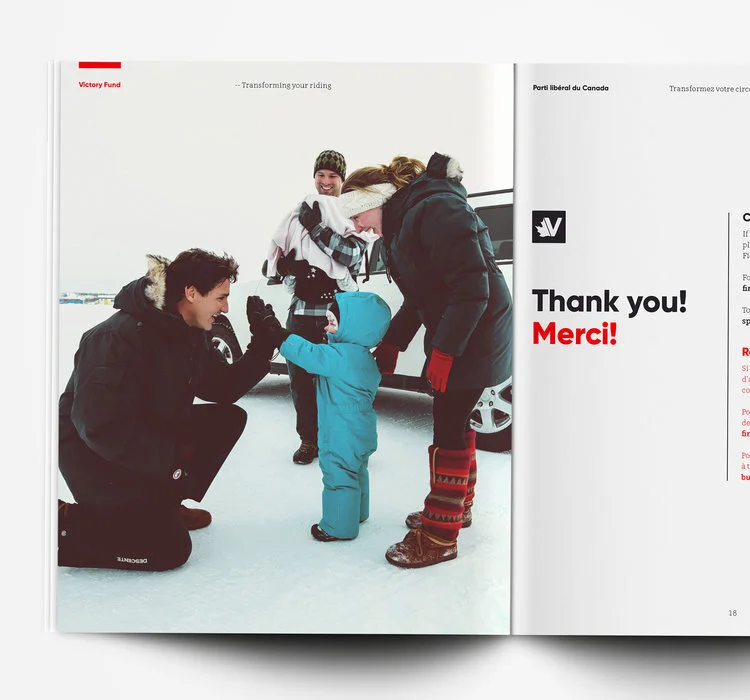 The Victory Fund is a Liberal Party of Canada fundraising program. I was to create a handbook providing information about this program, as well as physical products including buttons, stickers and tote bags.