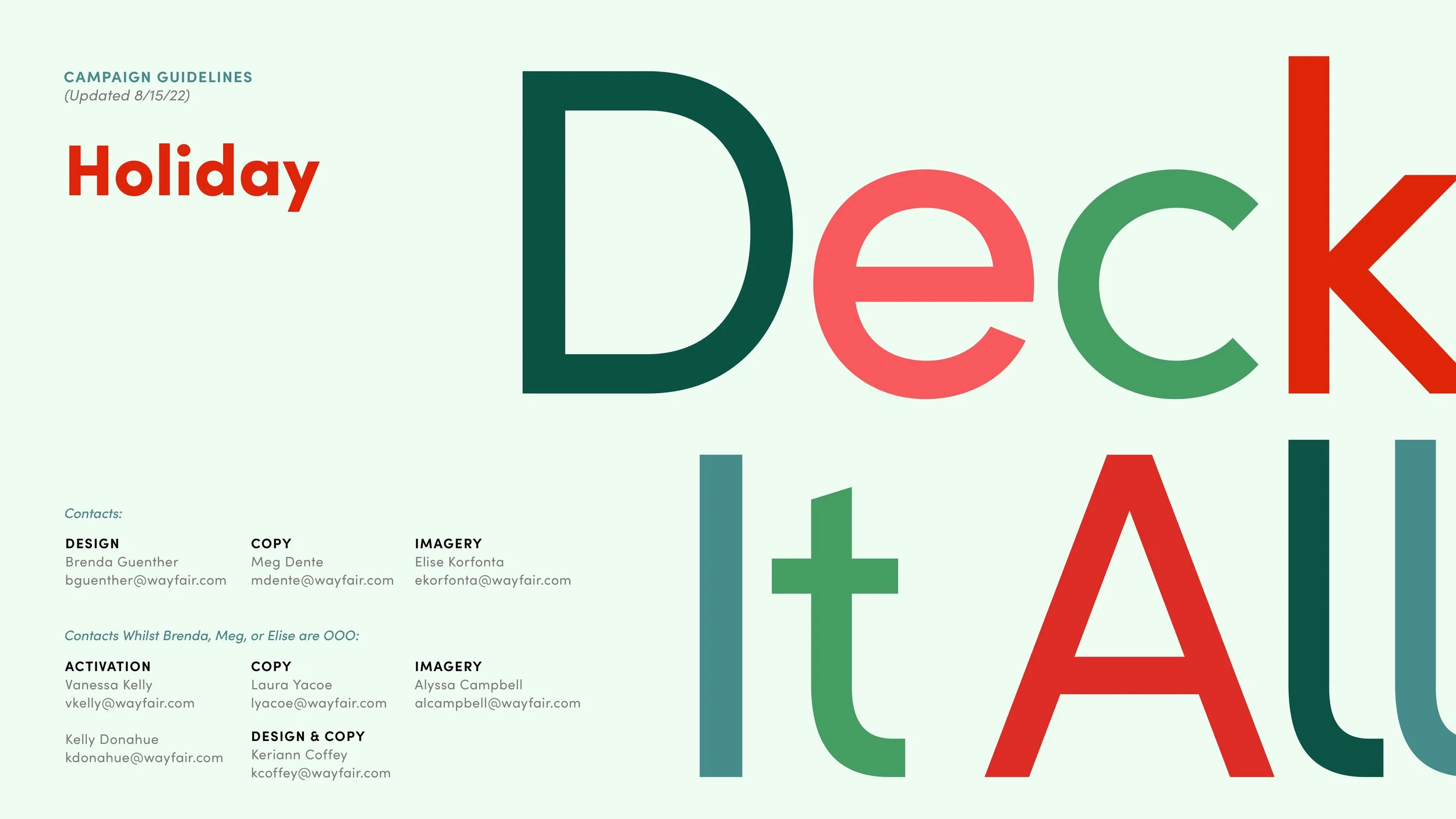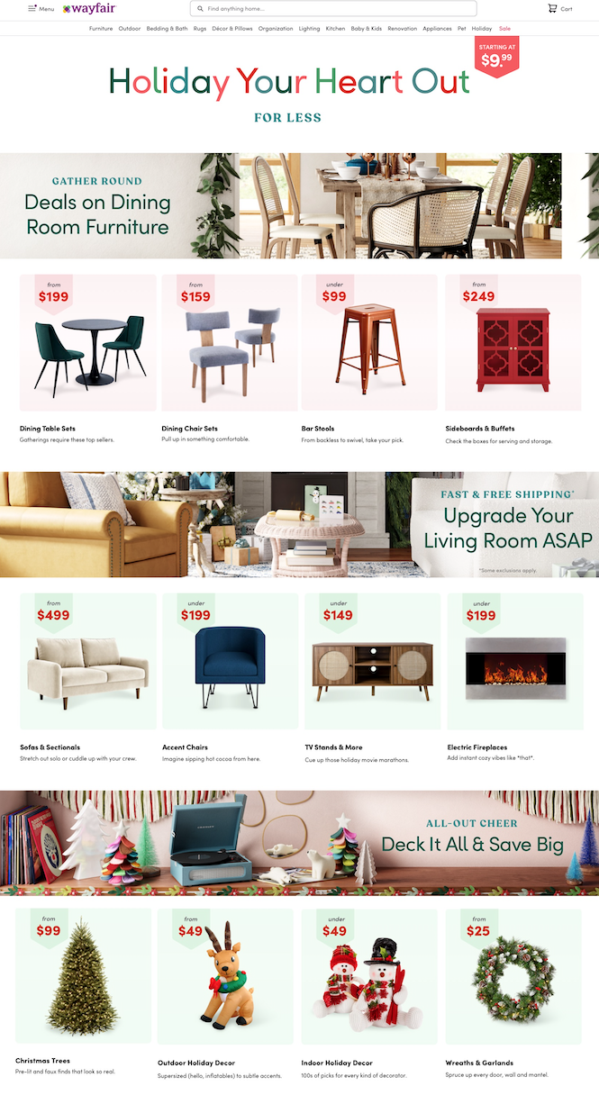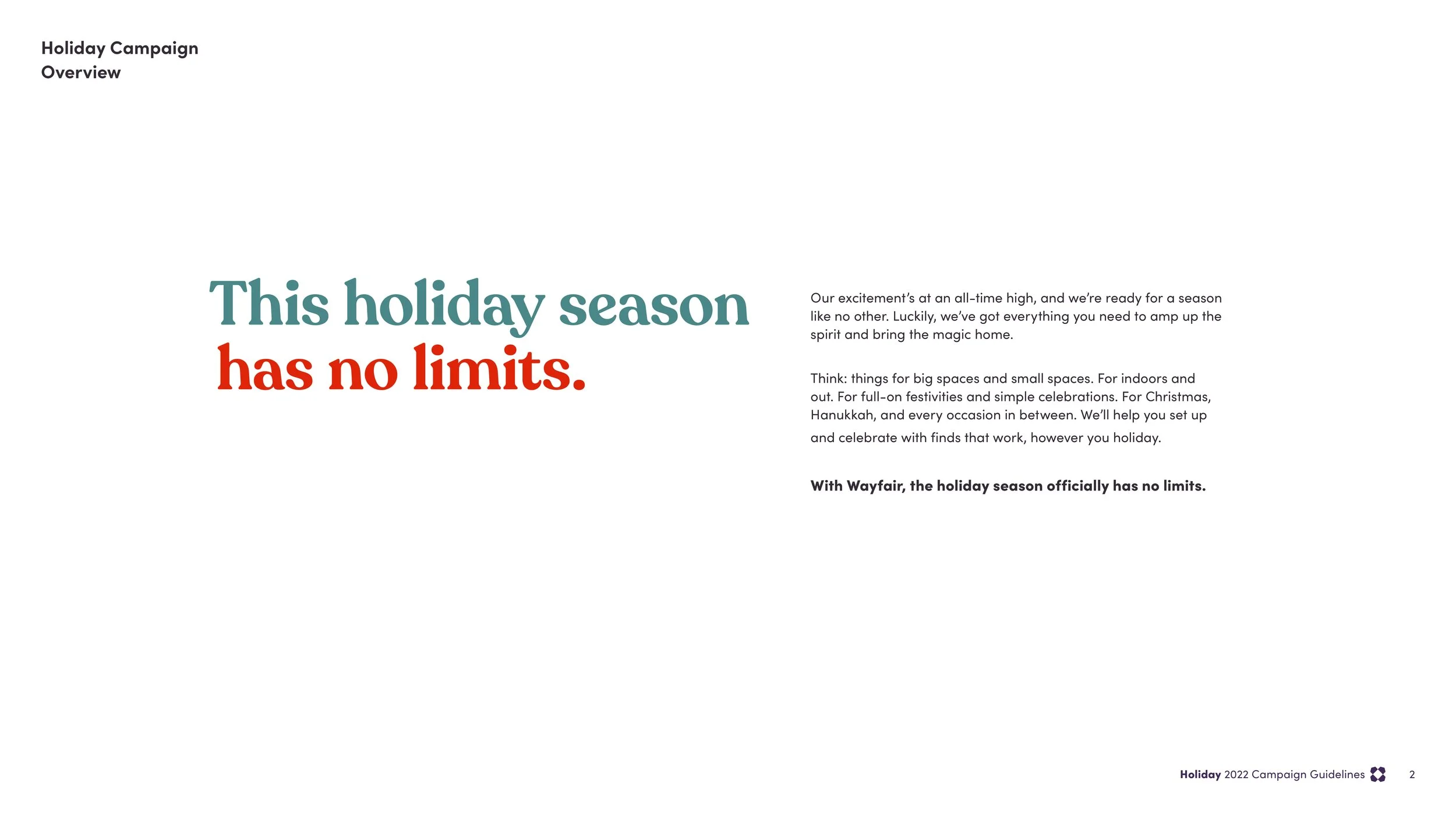 For Wayfair’s 2022 holiday season, the challenge was delivering a cohesive omni-channel campaign while adapting to shifting merchandising priorities and fast-moving marketing needs. I led the creative strategy and execution across two phases—October and November/December—developing distinct visual directions through 2D and 3D photography, dynamic imagery, and modular content systems. I also art directed the holiday photoshoot on set, ensuring visuals captured the tone and product focus needed to anchor the campaign. The result was a responsive, scalable creative framework that aligned seamlessly across all platforms and touchpoints.