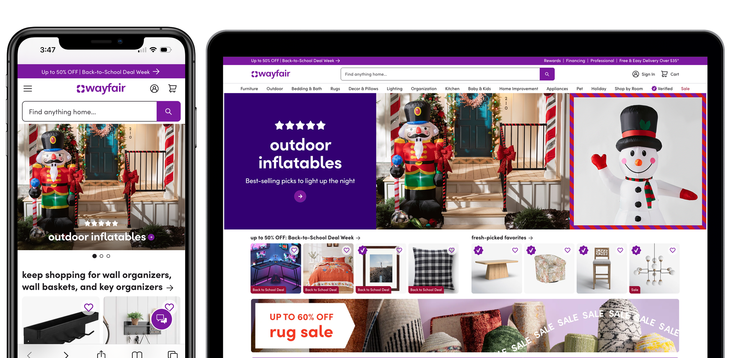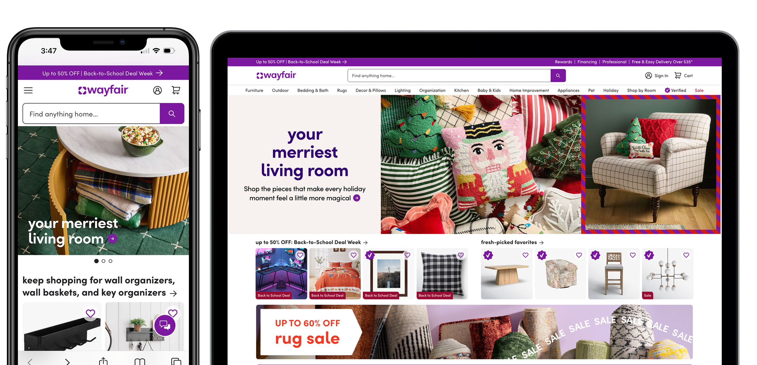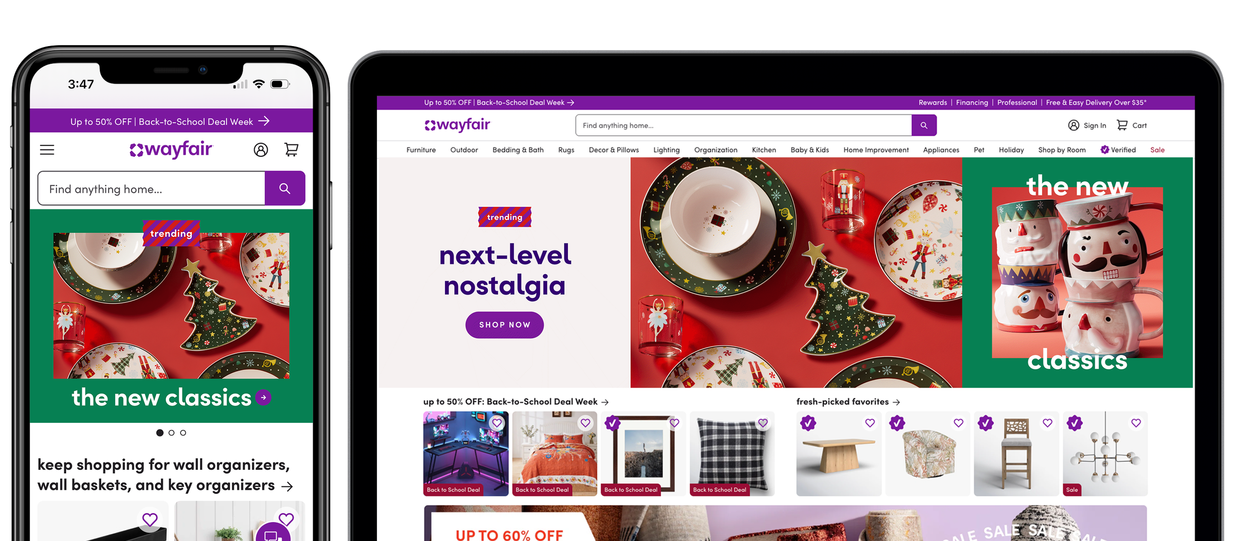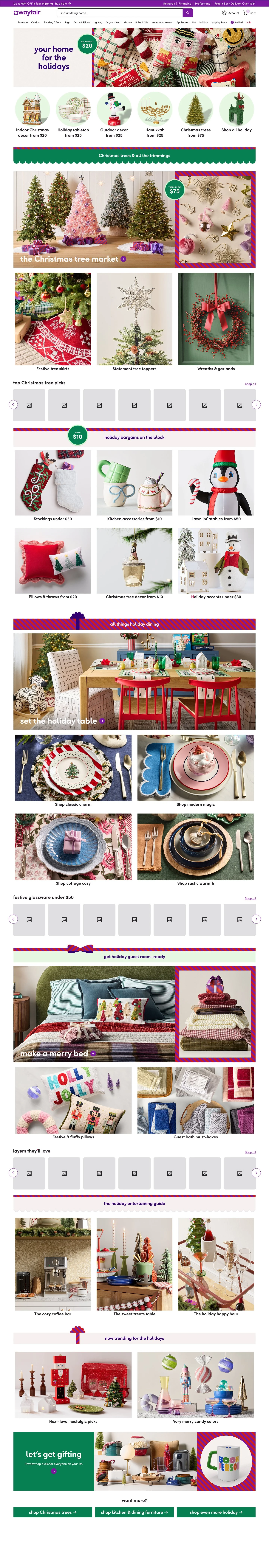 In progress for launch, Wayfair’s 2026 Holiday campaign builds on a simple but powerful Look & Feel I created: the Wayfair stripe, applied across all channels, including broadcast. The campaign spans 30+ homepage sliders, robust landing pages, and messaging voiced through multiple content vehicles, unifying what has historically been fragmented holiday storytelling. My focus has been establishing a scalable design system and sharing learnings across teams, ensuring cohesion, clarity, and impact at every touchpoint.