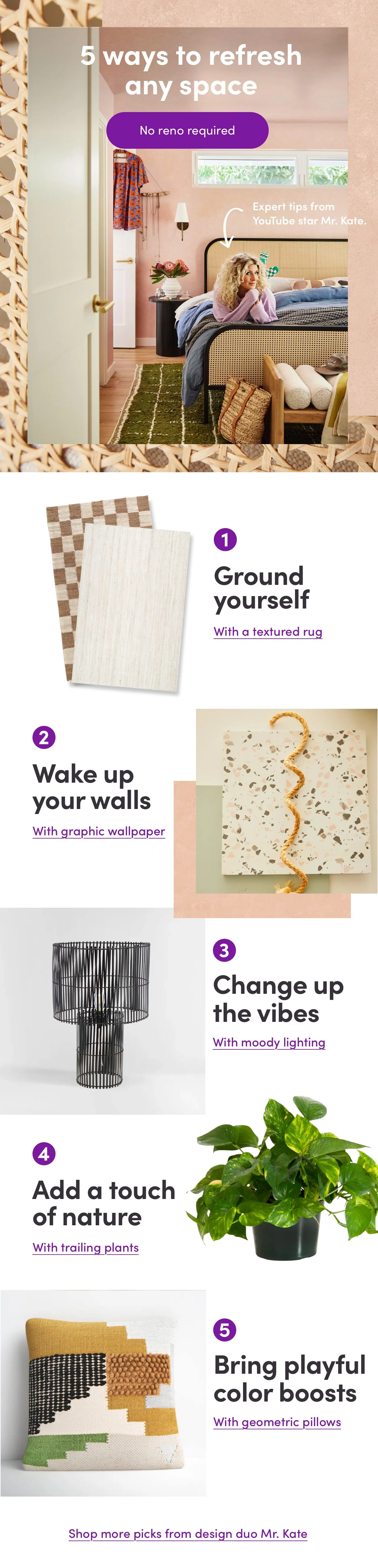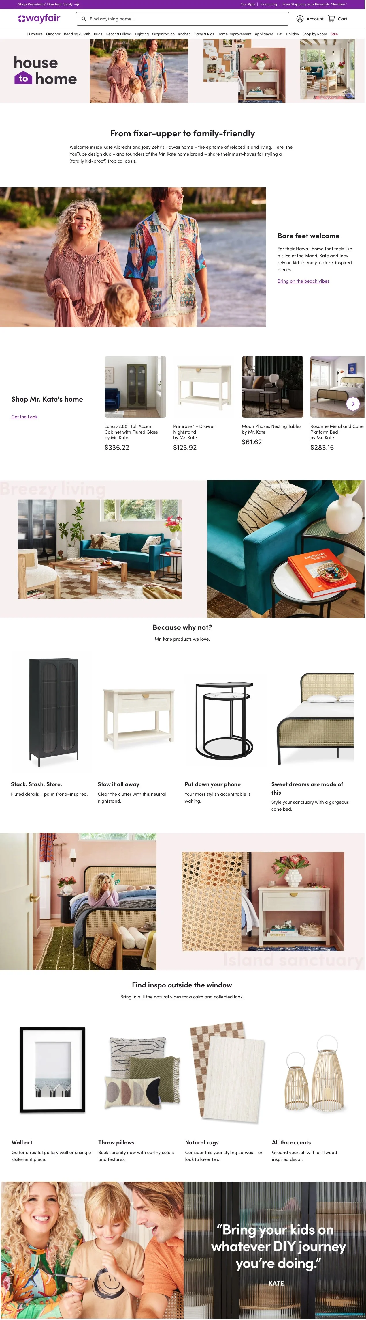 I led the creative vision and execution for Wayfair’s collaboration with Mr. Kate, transforming their signature bold, eclectic design aesthetic into an inspiring, shoppable experience. This campaign invited audiences into Mr. Kate’s world of playful, personality-driven interiors, making it easy to recreate their signature look with Wayfair’s vast product selection.