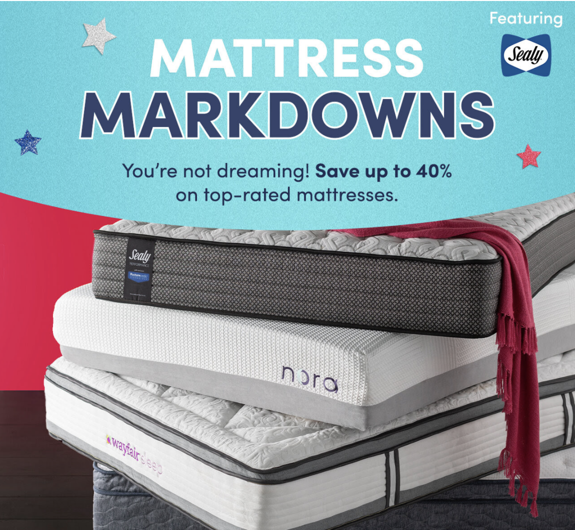 Presidents’ Day 2020 presented a design challenge: create a holiday feel without leaning into partisan or political visual tropes. I developed a playful look & feel as a “wrapper” — pulling in teal backgrounds, glitter stars, and SKU buttons — and applied it across on-site, print, email, and social assets for both U.S. and Canadian markets. The design became the primary visual system for both the Presidents’ Day Blowout and concurrent Mattress Markdowns campaigns, giving Wayfair a distinctive, unified look with flexibility across campaign tiers.