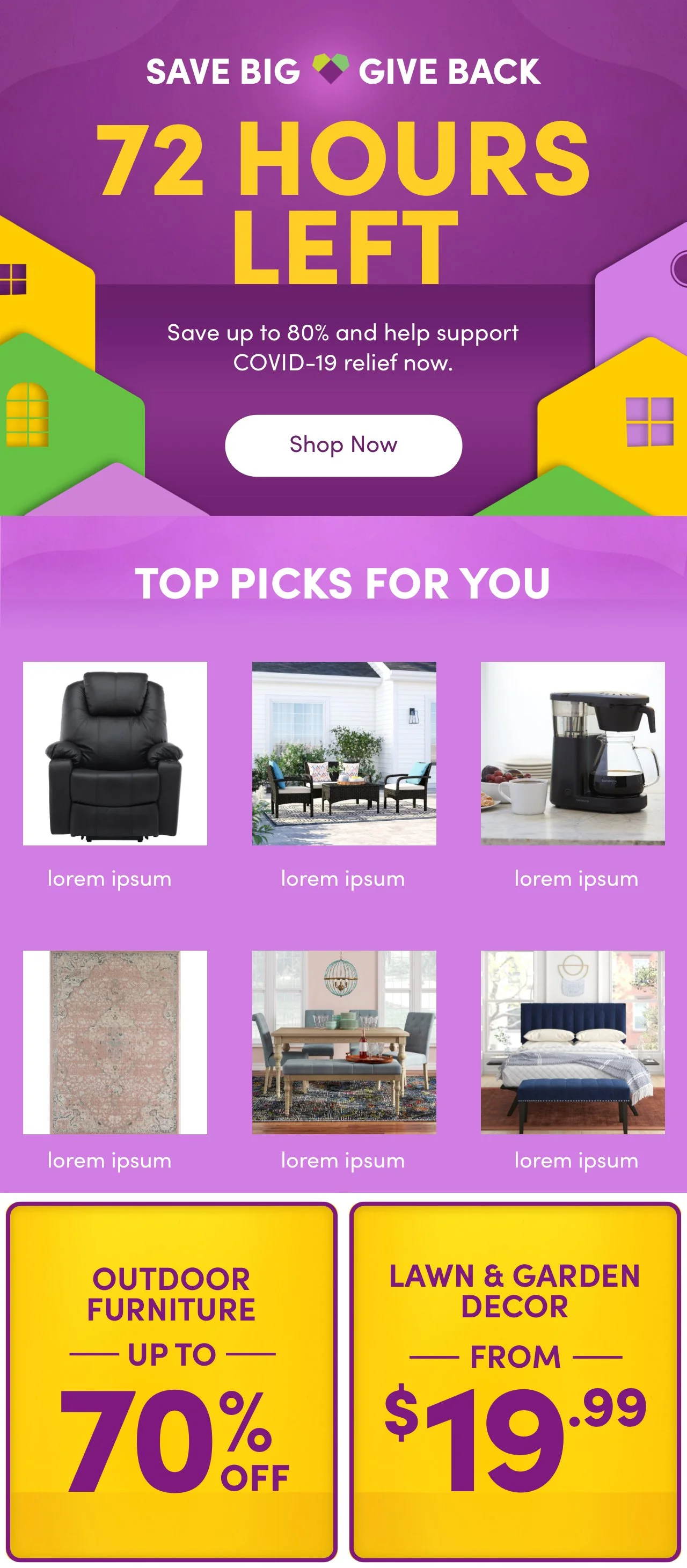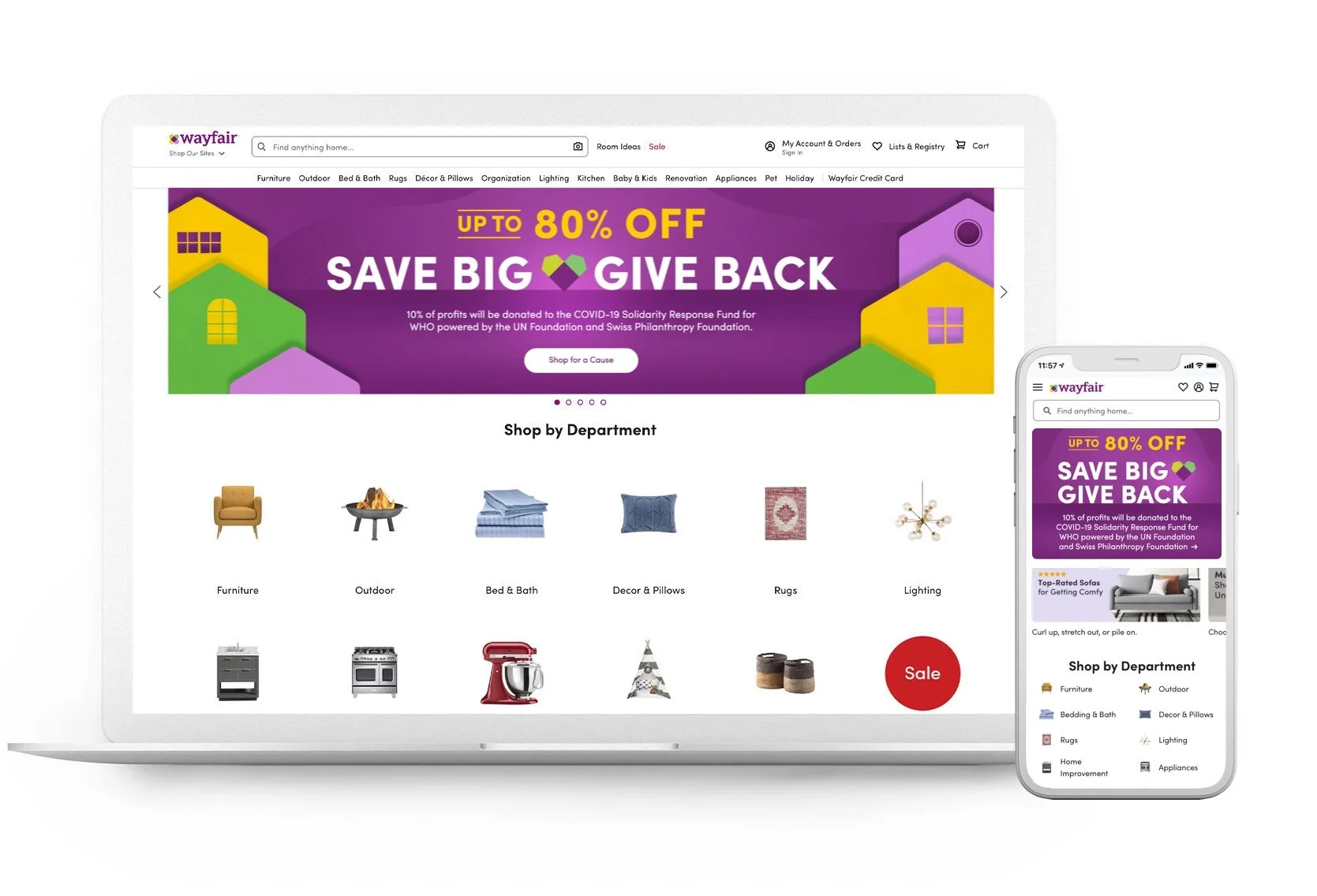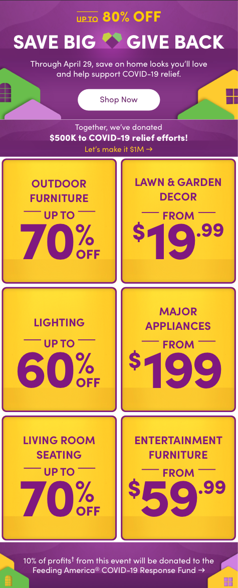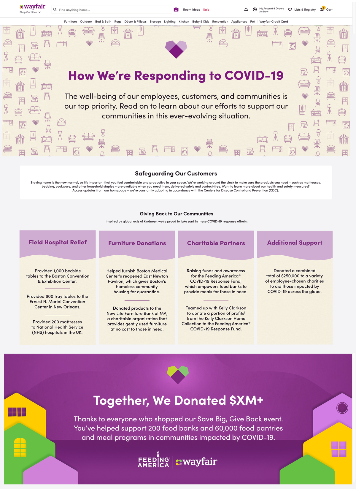 Launched in the thick of COVID, this promotion carried the dual challenge of meeting aggressive deadlines while navigating highly sensitive cultural and consumer dynamics. I partnered closely with a fellow senior designer, collaborating seamlessly to shape the creative direction and ensure consistency across on-site, email, and paid channels. Despite the pressure, we delivered a campaign that balanced urgency with empathy, reinforcing Wayfair’s brand promise of giving back while resonating with customers during a uniquely difficult time.